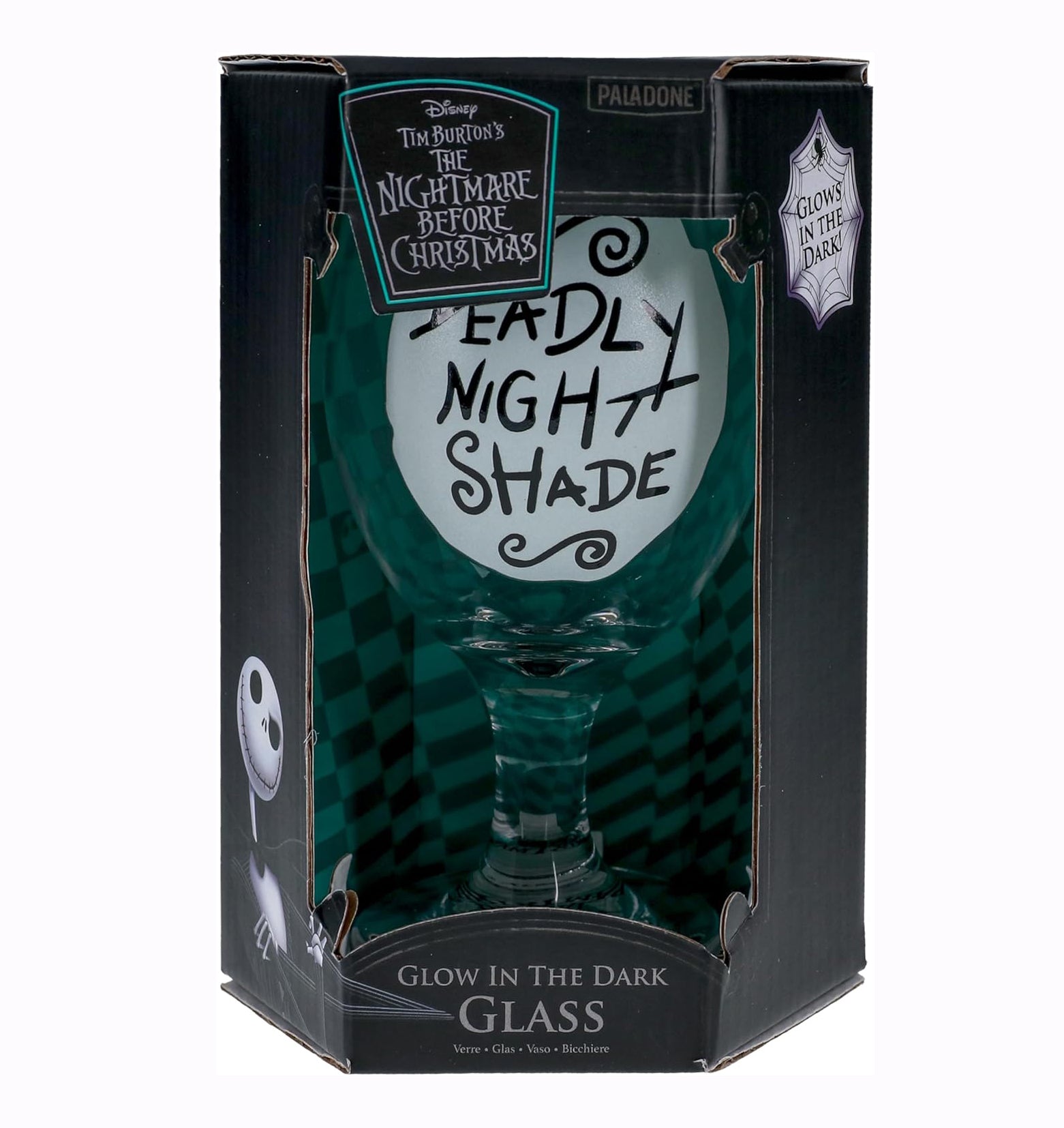 BRILLA EN LA OSCURIDAD: Experimenta el encanto de Pesadilla antes de Navidad de Tim Burton con este cristal que brilla en la oscuridad. Añade un toque inquietante a tu cocina y a tus vasos.